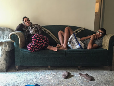 sofá del hostal en Esmirna (Turquía) junto a su hijo Alí.